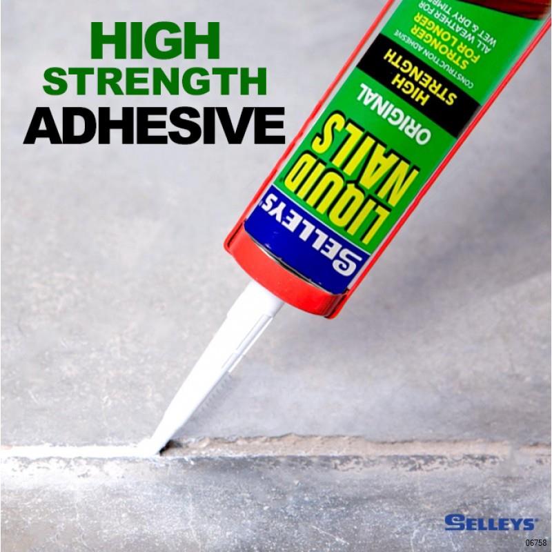 SELLEYS LIQUID NAILS is a premium grade multi-purpose construction adhesive that delivers a consistently strong and lasting bond on most building materials. Shrinkage and thermal movement in buildings can cause bonds to weaken over time, but Liquid Nails is flexible enough to response to movement allowing a strong bond to be maintained over time.
