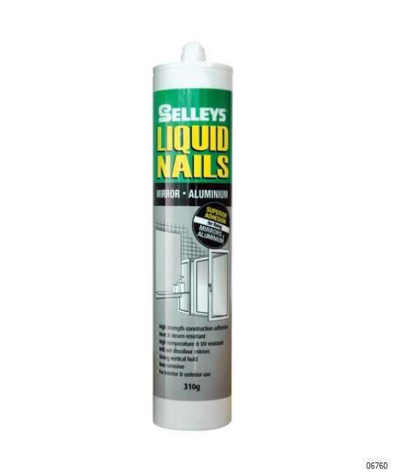 Selleys Liquid Nails Mirror, Metal and Glass is a premium grade, high strength construction adhesive that delivers strong bonds on mirrors, metal and glass.