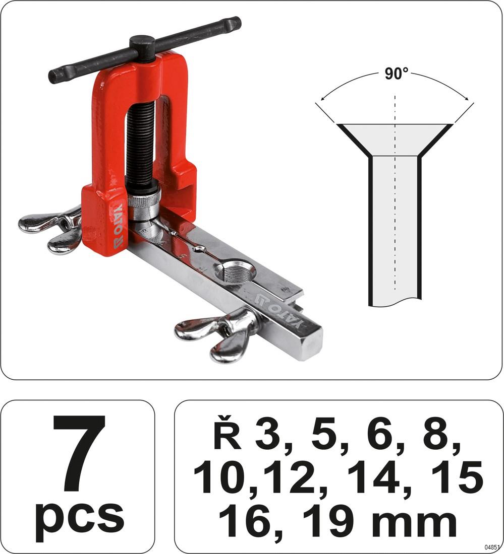 YATO Flaring and Tools Set contains Press for manual pipe expansion from 3-19 mm and also it contains flanges for making tapered connection with an angle of 90 °. It is most commonly used for heating pipes, air-conditioning pipes and brake installations.