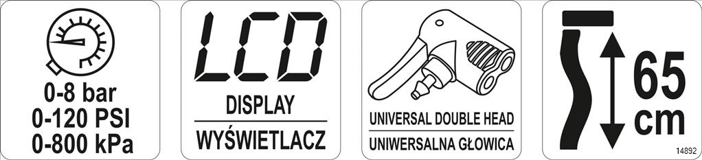 YATO Hand Pump is a pump with a maximum pressure of 8 bar. It is equipped with an electronic pressure gauge. It has a universal head for pumping car and bicycle valves. The hand pump is made of aluminum and durable plastic with a manometer graduated to 8 bar. It has a 65 cm cable and a solid base which makes it easy to hold the pump with your foot.