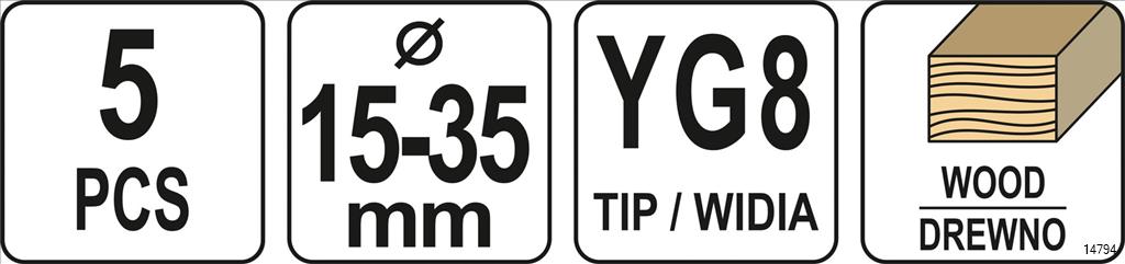 YATO Forstner Set is a set of wood drill bits especially for hinges. Designed for drilling precise holes without tearing the edges in soft wood, plywood and plastics. It is made of hardened, high-quality YG8 steel.