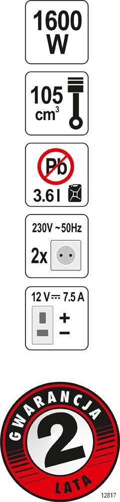 YATO Generator is a gasoline inverter power generator. It is powered by a 4-stroke 3 HP engine. It has a rated power of 1600 W. Maximum power output is 2000 W. It outputs an electric voltage of 230 V plus a 12 V socket. The gasoline tank has a capacity of 3.5 l and the noise level does not exceed 92 dB. Weight of the generator is 22 kg.