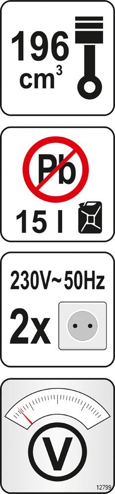 YATO Generator is an electrical-mechanical device in which mechanical energy is converted into electricity. The power generator consists of cooperating internal combustion engine and generator. The generator is sold complete and does not require assembly. Recommended fuel for this generator is unleaded gasoline with an octane number greater than 93.