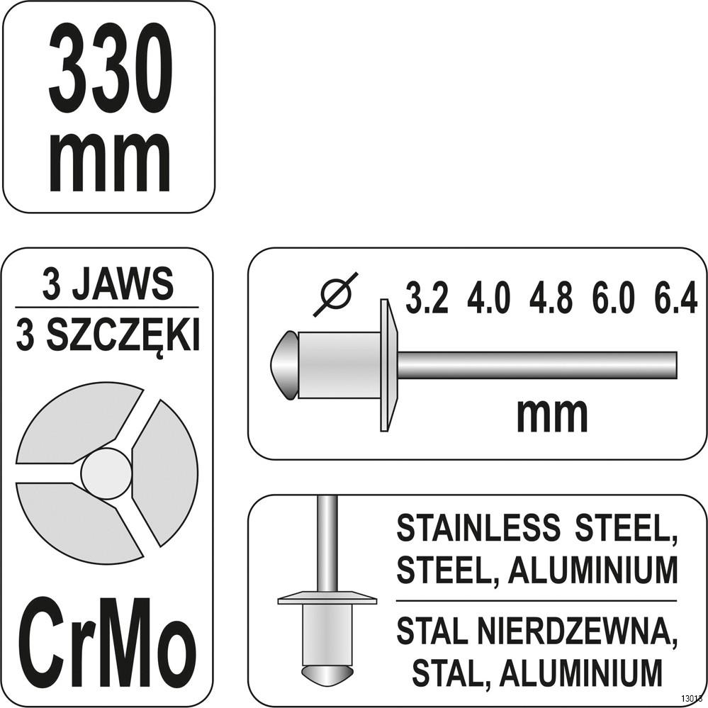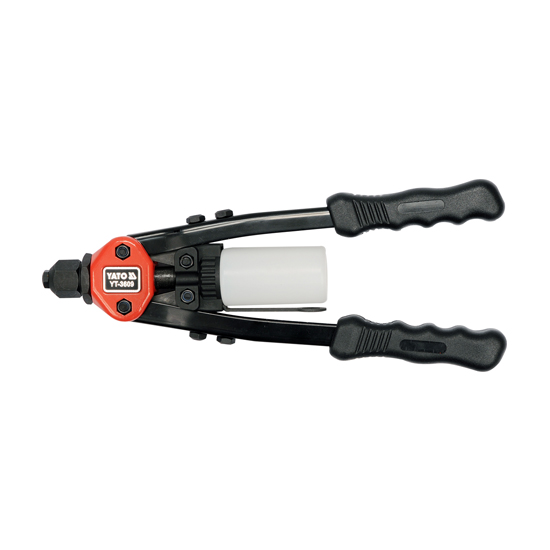 YATO Hand Riveter is a plier type riveter. Designed to handle steel, stainless steel and aluminum rivets. Supports rivets in the range of 3.2 mm, 4.0 mm, 4.8 mm, 6.0 mm, 6.4 mm. The heads is made of durable tool steel, chromium-molybdenum CrMo.