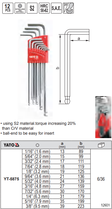 YATO Hex Key Set is made of high quality S2 material which ensure the quality and durability of the product. This set of hex key comes in full inch sizes from 1/16 "to 3/8" to make your repair work simpler. This hexagonal ball design in this hex key set has an advantage over ordinary hexagons because of a ball head, because when you need to disassemble or assemble parts in difficult positions it can allow this hexagon to a certain angle and still The good parts can be screwed or removed without affecting the bolt head.