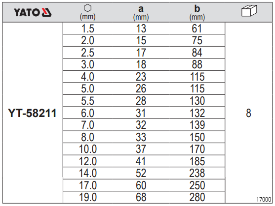 This set contains: 1.5 mm, 2 mm, 2.5 mm, 3 mm, 4 mm, 5 mm, 5.5 mm, 6 mm, 7 mm, 8 mm, 10 mm, 12 mm, 14 mm, 17 mm, 19 mm
