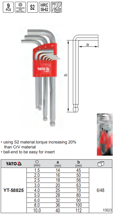 YATO Hex Key Set contains 9 detailed metric hex keys which is one of the indispensable tools in factory repair equipment, company or mechanical workshop, home repair, etc. where the main function is to hold and rotate the hex nuts. This type of hex keys will respond to high torque because it has undergone a heat treatment to achieve good hardness when being using. The product is made of stainless steel material with high hardness, so it is not bent or broken over the head when applying great force. The details are made from CrV alloy steel which is durable, and do not rust during use. There is also powder coating to increase the durability of the product.