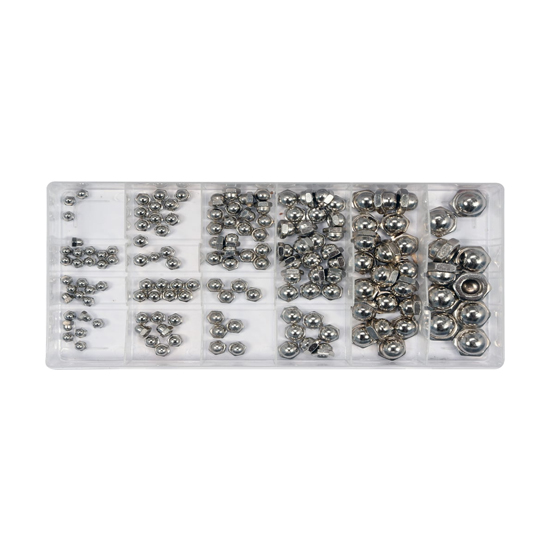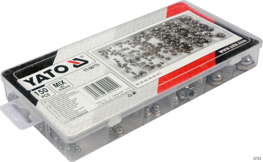 YATO Hex Nut Assortment Set is a set of 150 metric closed nuts which is assorted in size. The set includes sizes M3, M4, M5, M6, M8, M10 sizes. The pack comes in a convenient "sorter" type package.
