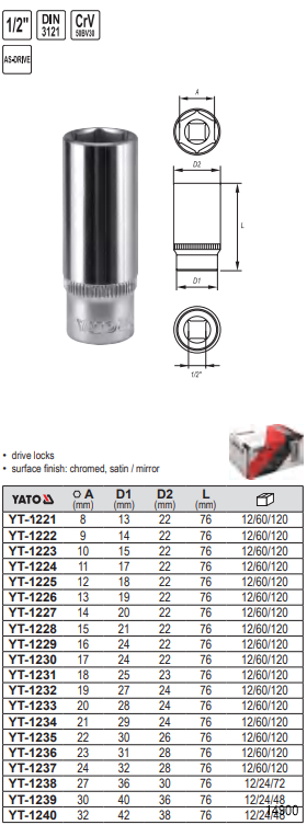 YATO Hexagonal Deep Socket is a 1/2 inch Drive Deep hexagonal socket which comes in sizes from 8 mm to 32 mm. It is made up to DIN 3121 standard. These sockets are made from Chromium vanadium steel with a chrome finish.