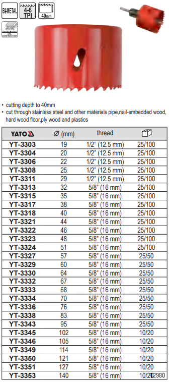 YATO HOLE SAW BIMETAL 19MM-140MM