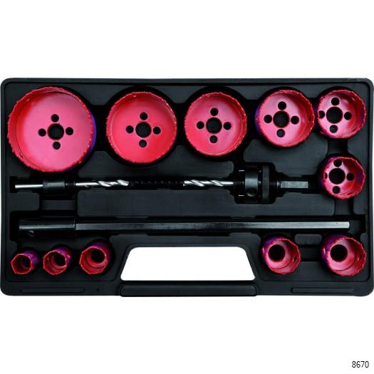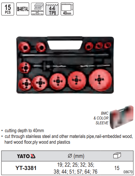 YATO Hole Saw Set is a professional bi-metal hole saw set with 15 pcs. This hole saw kit will stand up to the rigors of cutting hard materials like cast steel, cast iron, stainless steel, alloyed and not alloyed aluminum, bronze, copper, pvc, acrylic and wood. This set includes two arbors with spring to easier removal of cut material and extension bar of 300 mm. The hole saw body is made with high quality alloy steel HSS M3 cutting edge.4-6 TPI with variable pitch.