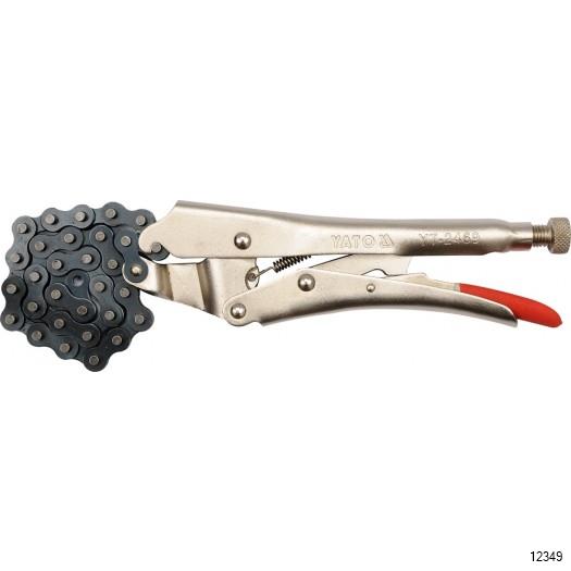 YATO Locking Pliers With Chain is a welding plier with a total length of 250mm. They have a screw adjustment of the opening that allows you to adjust the spacing of the jaws depending on the size of the gripped material. The max chain length is 500mm. They have a European type closure with a nickel-plated surface.