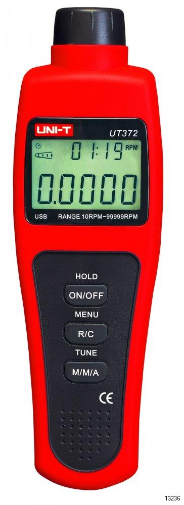 UT370 series non-contact tachometers measure rotating speed of shaft or disk with a point laser and reflective tape on the object being measured. These meters can output RPM or count readouts without interfering with the equipment being measured.