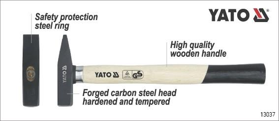 YATO Mechanist Hammer has a cold-forged hammer head, blackened surface which is mounted on a wooden, varnished handle and joint secured with a metal ring wedge. The handle under the head is secured with a metal sleeve and additionally a rubber cover ring. This item is design in accordance with GS and DIN1041 standards.