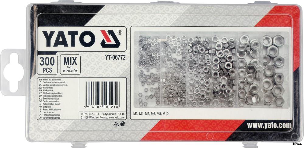 YATO GI Nuts Assortments Set is a set of 300 pieces of metric nuts which includes sizes M3, M4, M5, M6, M8, M10. The nuts are placed in a convenient "sorter" type package.