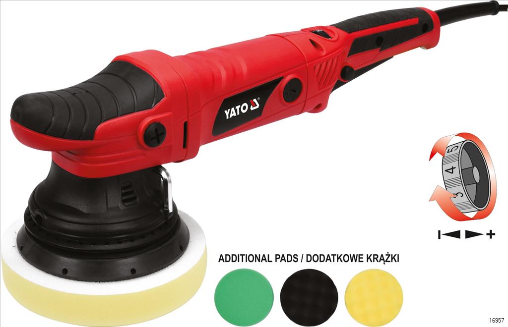 YATO Orbital Polisher is an eccentric polisher equipped with speed control and a system of maintaining power at low speed , also with strong pressure of the machine. The device is durable and comfortable during operation. Thanks to the simultaneous movement of the head in two directions (rotational and elliptical movement) , this type of machine spreads the polishing paste more efficiently, without overheating the material and evaporation of water from the polishing paste.