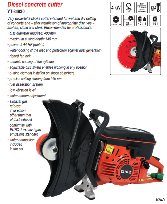 YATO Petrol Cut-Off Saw is a very strong two-stroke cut-off machine designed for dry and wet cutting of concrete and - with the appropriate type of disc - asphalt, stone and steel . Recommended for professionals.