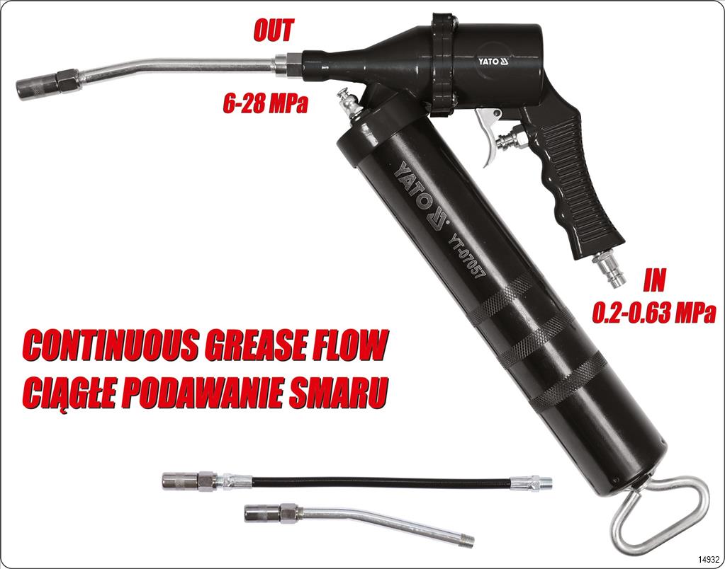 YATO Pneumatic Grease Gun is an efficient lubricator designed for the application of solid lubricants. By pressing the trigger, it enables the lubricant to be applied continuously. Used in car workshops, agriculture and industry for the maintenance of parts and devices with a kalamitki type lubrication system.