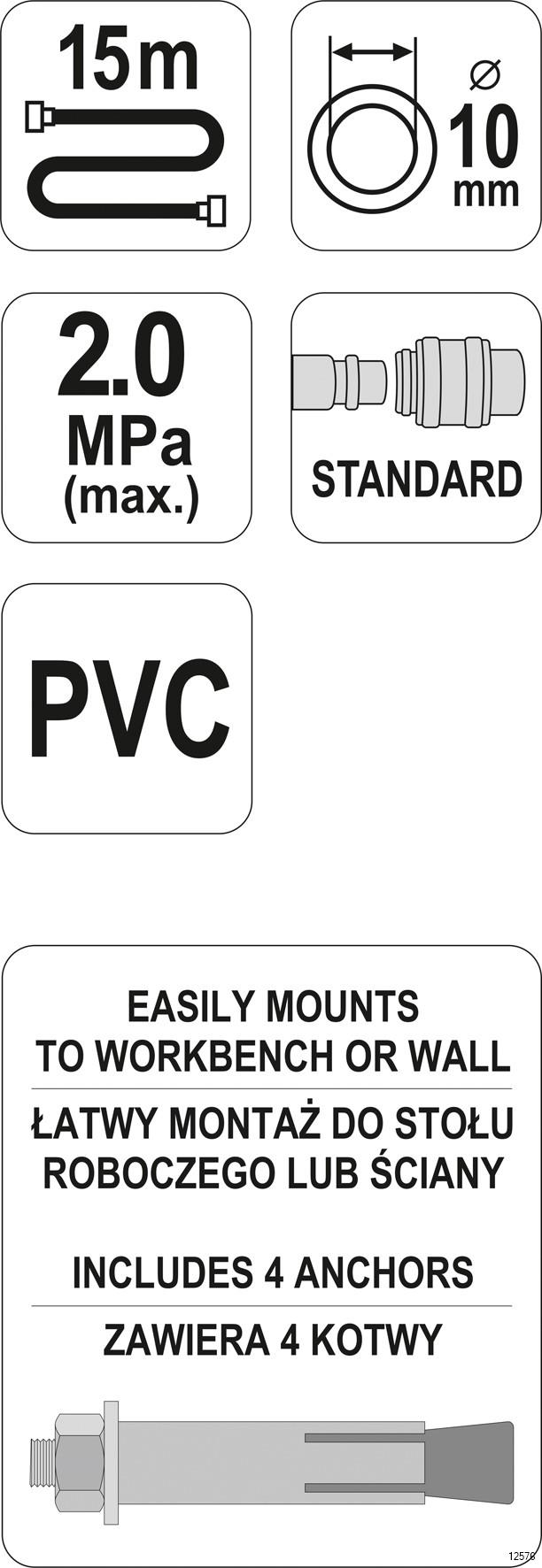 YATO Pneumatic Hose Reel comes with 15m of with a rolling handle. The connection length is 60cm. This item can be installed on the wall or on the floor. The hose is crimped with standard quick couplings.