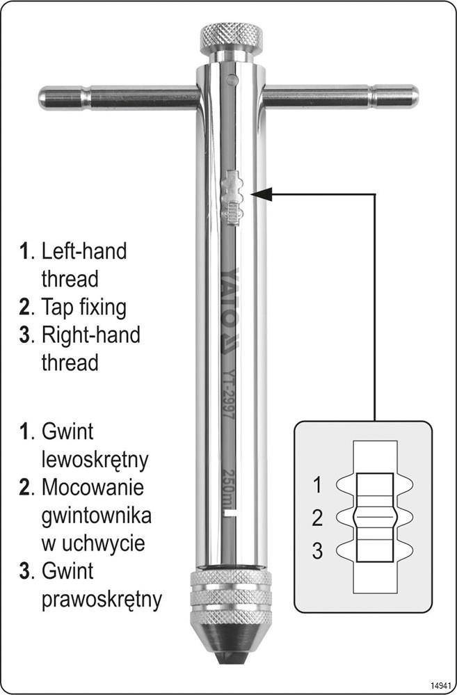 YATO Ratchet Tap Wrench is a professional T handled ratchet tap wrench. It can operate sizes M3-M10 and is 250 mm long. It is reversible and has lock position. The item is polished with chrome finish for rust resistance. It has both ratchet reverse and forward action.