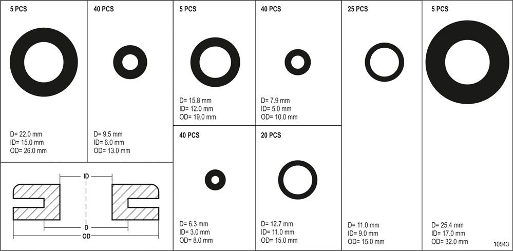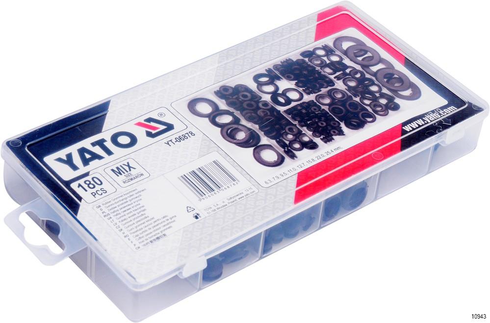 YATO Rubber Ring Grommets Set is a set of rubber grommets containing 180 pieces of various sizes. The rings are placed in a convenient "sorter" type package.