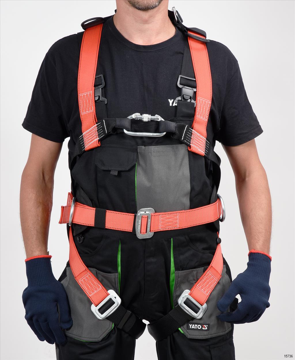 YATO Safety Harness with the waist belt is an element of the system designed to protect people against falling from a height. Properly fitted harness must fit tightly to the torso, belt and thighs so that, together with the dedicated attachment point, they can evenly distribute the forces acting on the body during a fall.