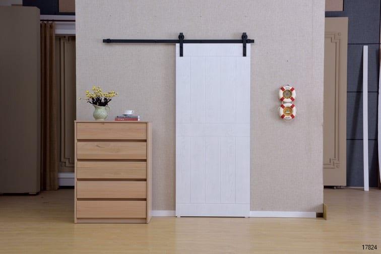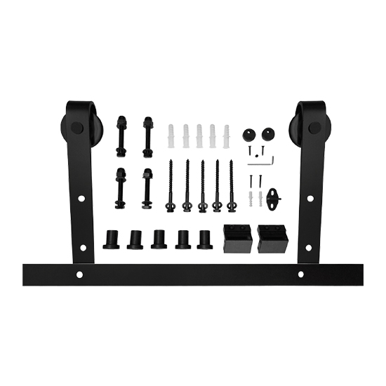 Sliding door set suitable for use in conjunction with the room door that emphasizes ease of use. It can be applied to a room with limited space. This set is a black flat track sliding barn door set with front mounting.