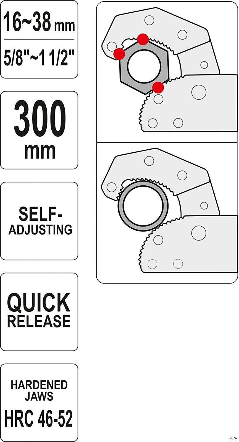 YATO Auto Adjustable Pipe Wrench is a universal wrench with a length of 300 mm. Due to its movable upper jaw it allows for automatic adjustment to the size. Due to this it allows for work in the range from 16mm to 38mm. The jaws (14mm wide) are made of very hard carbon steel. They also have hardened teeth with a hardness of 46 ~ 52 HRC. The ergonomic handle is made of ABS and non-slip TPR , which significantly increase the comfort of work.