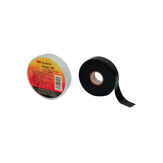 Scotch® Tape Super 88 is an abrasion resistant tape that provides electrical and mechanical protection with the combination of an aggressive rubber resin adhesive and an elastic PVC backing. This tape is highly resistant to UV rays, moisture, alkalis, acids, corrosion and varying weather conditions. The tape is compatible with solid dielectric cable insulations, as well as epoxy and polyurethane resins. UL Listed, CSA Certified and RoHS 2011/65/EU Compliant.