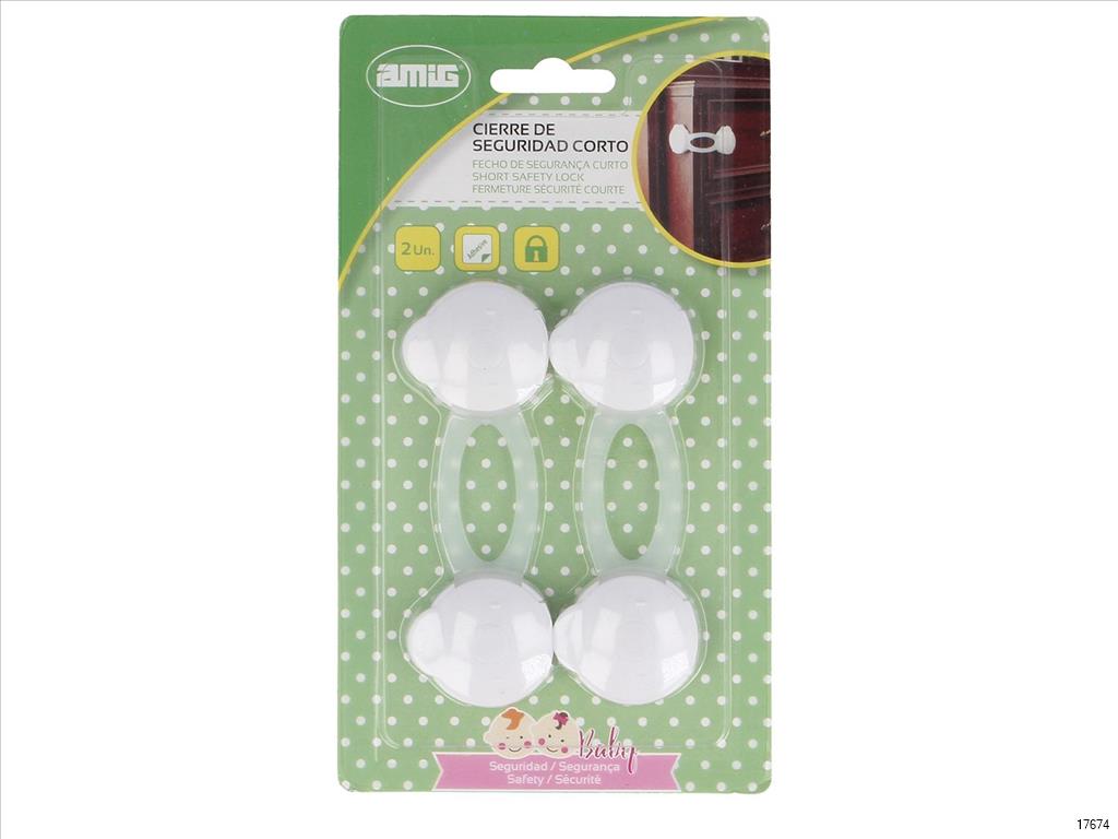 Short multipurpose safety lock that prevents the opening of closet doors, refrigerators and toilets.