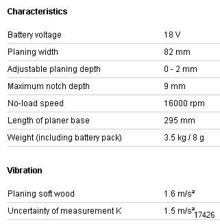 Light, compact cordless planer for planing, rebating and chamfering with adjustable planer depth and notch depth. Angled chip ejection adapter for controlled ejection of the wood shavings. Easy to empty textile dust bag for working without extraction facilities & Strap on the planer base for stopping the machine and to protect the work piece.