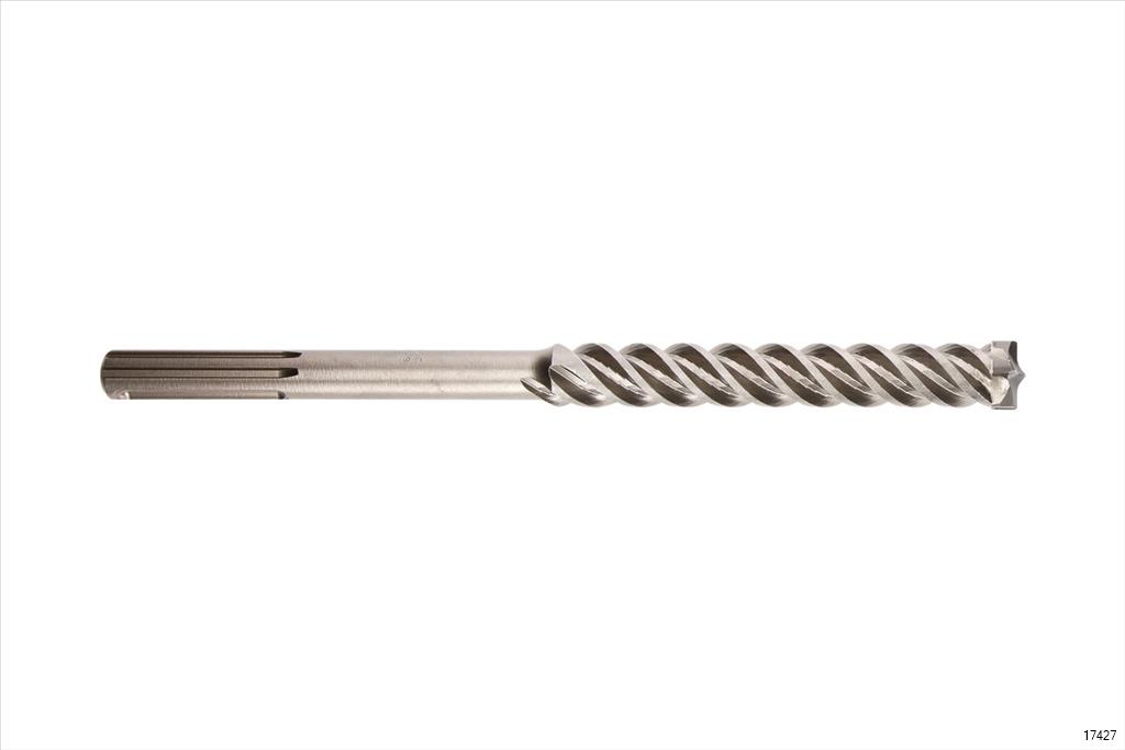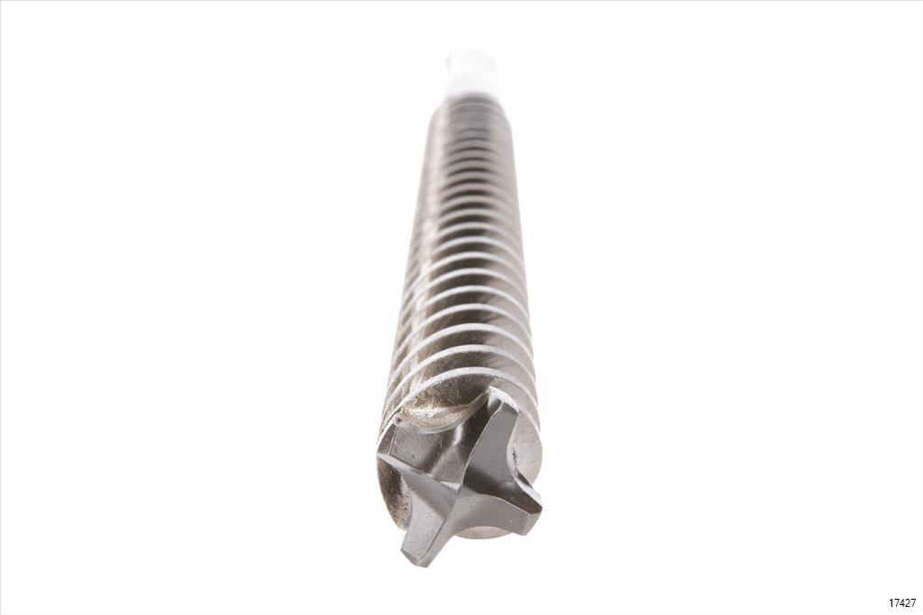 Extremely robust and aggressive full carbide bit head, 4 cutting edges for extraordinary service life and tool life in strong concrete. Wear marking on both sides of the main plate acts as an indicator allowing you to assess the measure of the dowel holes.. The 4-spiral helical geometry ensures low-vibration drilling behavior and low spiral wear.
