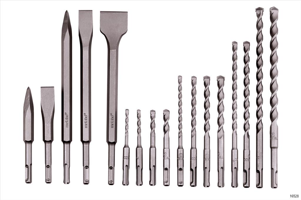 - Consisting of: Ø 5, 6, 8, 10 L=110 mm / Ø 6, 8, 10, 12 L=160 mm / Ø 8, 10 L=210mm / Ø 12, 14 L=260mm / Pointed Chisel L=140mm, L=250mm / Flat Chisel 20x140mm, 20x250mm / Scaling Chisel 40x250mm