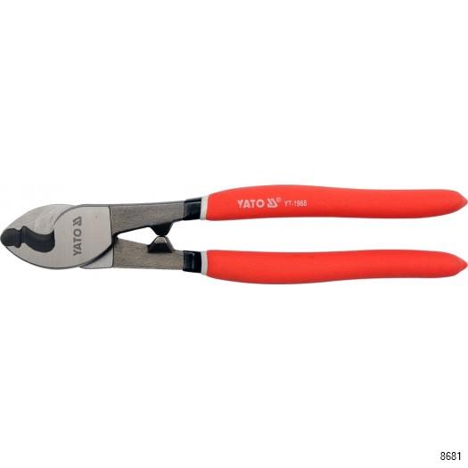 YATO Cable Cutter is a cold forged wire cutters with two-component tips on the handle. The cutting jaws is hardened to the level of HRC 55-60 CrV50 forged steel. The body is hardened to the level of HRC 42-48.