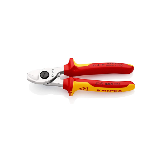 This KNIPEX Cutter handles are insulated with multi-component grips. This is used for cutting copper and aluminum single conductors as well as multiple stranded cables. With adjustable bolted joint and self-retaining screw.