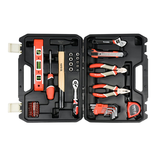 - It includes, among others spirit level, 1/4 ″ ratchet, hammer, pliers, tape measure, sockets and bits