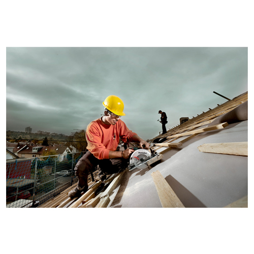 Robust circular saw can be used directly on guide rails from Metabo and other manufacturers for precise, long cuts.