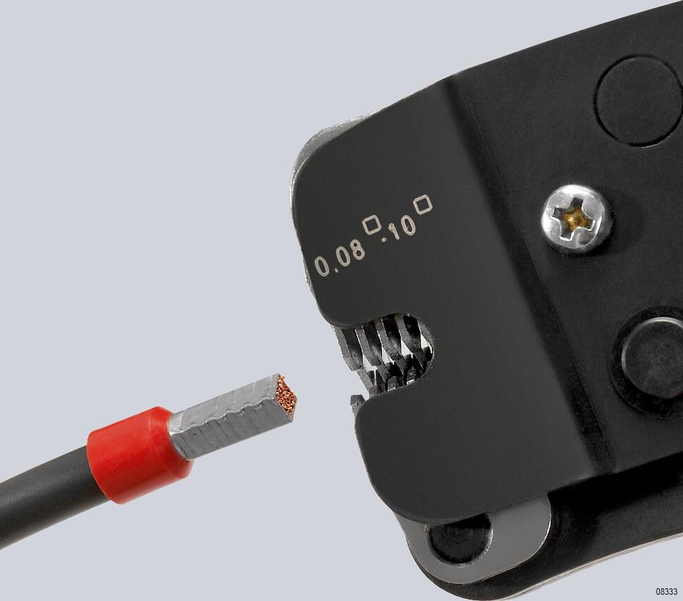 KNIPEX Crimping Plier includes compression from 0.08 - 10.0 and 16.0 mm² in one profile. With selector lever for setting the crimping area either to 0.08 - 10 mm² or 16 MM131. This is suitable in particular for all twin end sleeves (ferrules) up to 2 x 6 mm² or 2 x AWG 9.