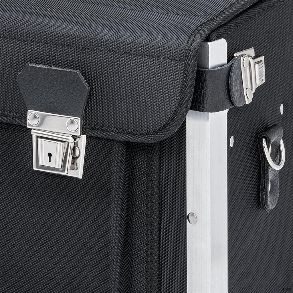 - Semi-fold-out front with adjustable loops and exterior document compartment