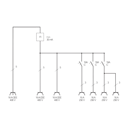 - Wall distributor with 2 CEE sockets, 4 protective contact sockets (protective contact sockets distributed on all 3 phases) and one connection socket