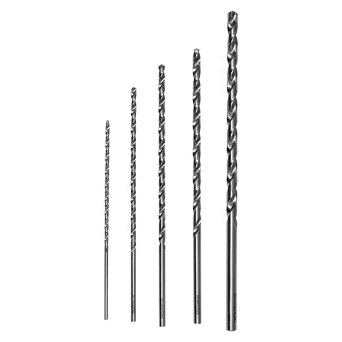 A set of drill bits for metal with a total length of 150 mm to 240 mm. Cross-cut drill tips, so-called 118° split point.