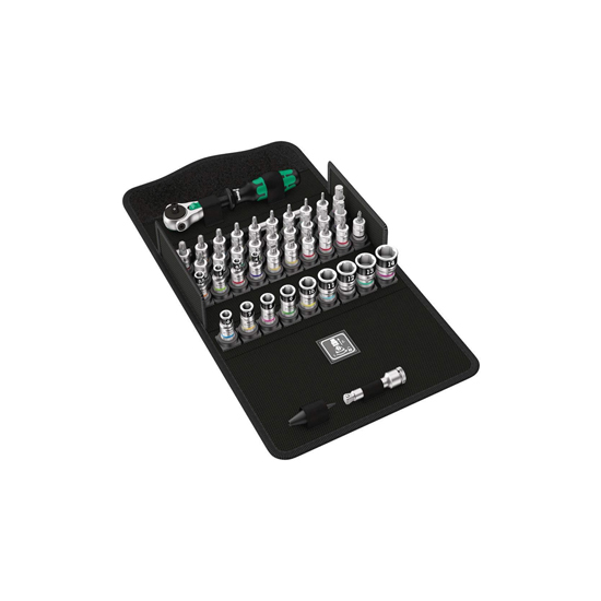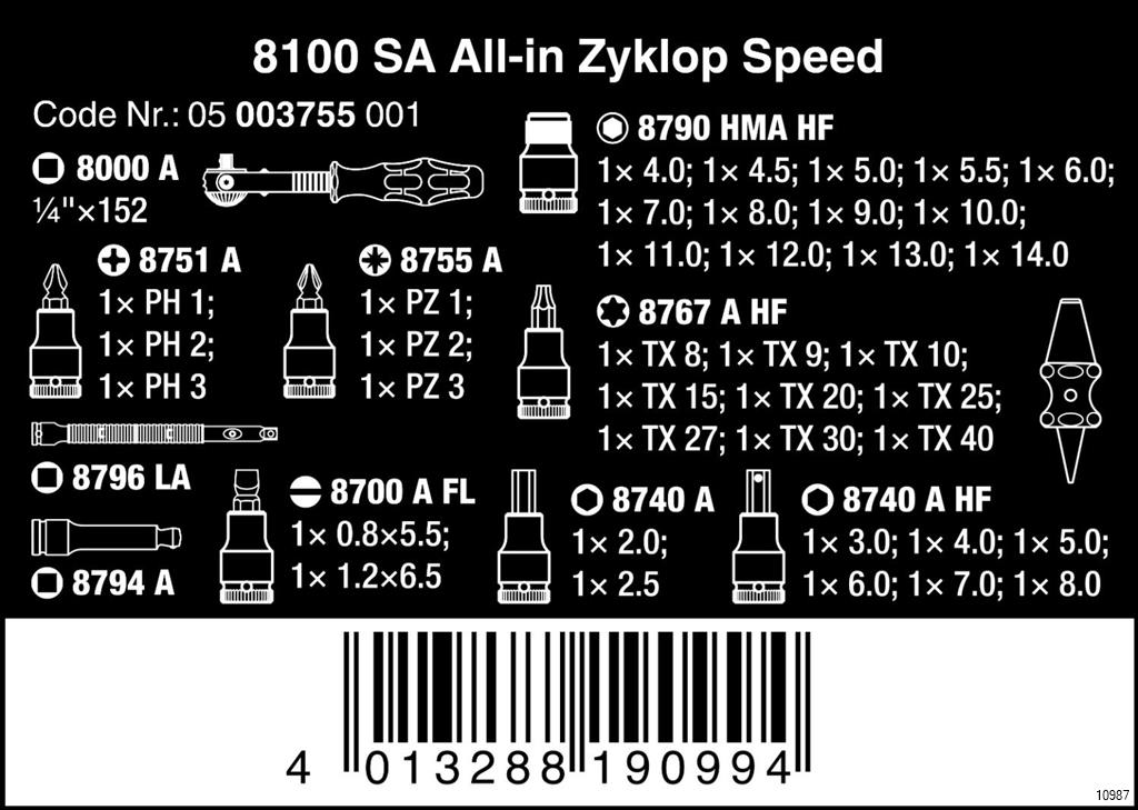 WERA 8100 SA ALL-IN ZYKLOP SPEED RATCHET SET is an incredibly compact set arrangement with many tools in a minimum of space. A completely new ratchet set with the unique textile boxes that are very robust and durable. They can be positioned upright for tidy storage on the workshop shelf. Additional surface protection due to textile outer material and low weight and volume for simpler mobility.