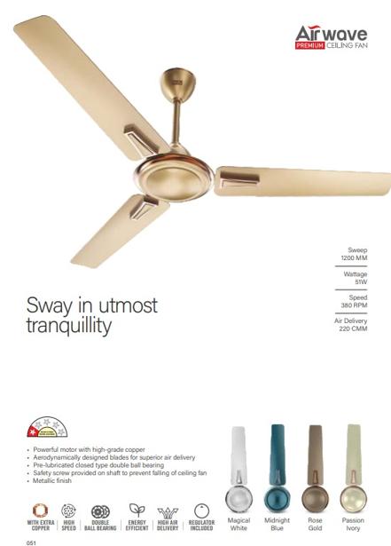 A constant flow of good vibes and freshness is what makes living truly comfortable. With sleek exteriors, powerful motor with high-grade copper for high-speed air delivery and efficiency, it is always going to be a good time with the AirWave premium ceiling fan! The additional designer trims add elegance to the fan further complimenting your home.