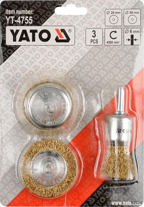 YATO Cup Brush Set contains three brass wire brushes. The shaft of these cup brushes has a diameter of 6mm. This item is used for professional anti-corrosion and renovation works. And also for removing rust, paint, burrs, smoothing hard surfaces.