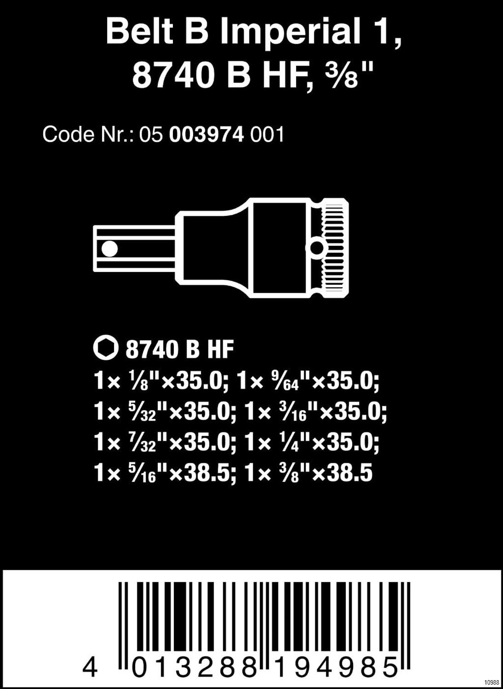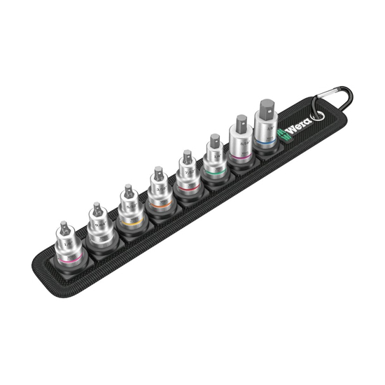 WERA designed robust textile belt with 8 in-hex bit-sockets taking up minimal space. A smooth twist to unlock mechanism ensures a secure fit and simple removal of the sockets. Comes with "Take it easy“ Tool Finder with colour coding according to size to enable the right tool to be selected easily and quickly. Includes a snap hook for secure fastening to a belt loop or pocket.