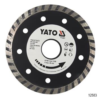 YATO Turbo Diamond Wheel is a high quality diamond cutting disc intended for professional use in construction, handicrafts, finishing work. It is sturdy, has a durable construction which is a metal plate with diamond full diamond embankment. Used for cutting concrete, brick, tile, mason, stone, sandstone. Designed to work with angle grinders and tile saws.