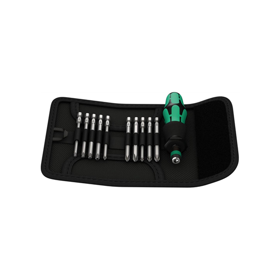 17-piece set with bits in a length of 89 mm in a practical pouch. 1 holder 816 RA Kraftform with ratchet function: fine-toothing for a small return angle, switchover ring (right, fixed, left), maximum torque of up to 50 Newton meters. ¼” hexagon socket head take-up and Rapidaptor technology for low-fatigue working and rapid bit change; magnetic.
