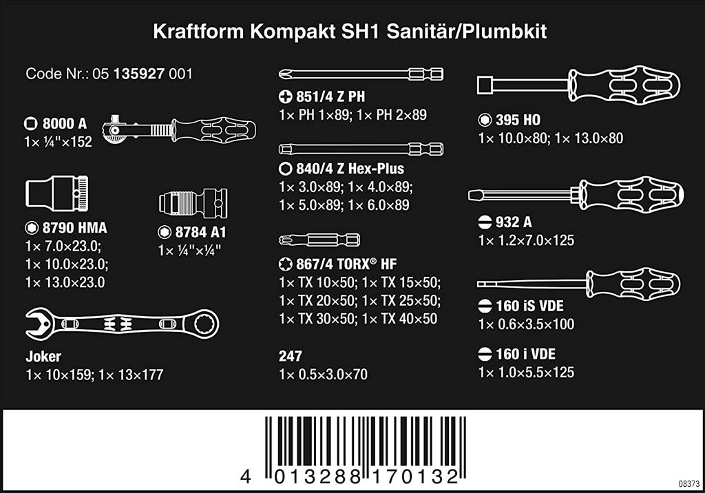 | Contents | 2 JOKER open-end wrenches, the ¼ ”Zyklop ratchet and accessories, 6 x 89 mm bits, 5 multi-component Kraftform Plus screwdrivers and voltage tester. Two JOKER combination ratcheting wrenches with special holding plate, 1 Zyklop ratchet 8000 A (1/4 "), 3 Zyklop sockets 8790 HMA, 1 Zyklop adapter 8784 A1 for bits; 6 TORX HF bits 867/4 with holding function for TORX screws, 1 voltage tester 247; 2 Kraftform series 100 slotted screwdrivers 160 i and 160 iS, 1 Kraftform Chiseldriver 932 A (slotted) with hex blade, 2 nutsetters 395 HO with hollow shaft