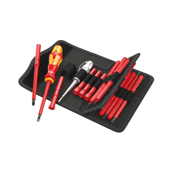 16 VDE interchangeable blades with 817 VDE Kraftform handle in a robust belt pouch. Individually tested tools as per IEC 60900. Individual test in water bath at 10,000 volts for secure work at the permissible voltage of 1,000 volts.