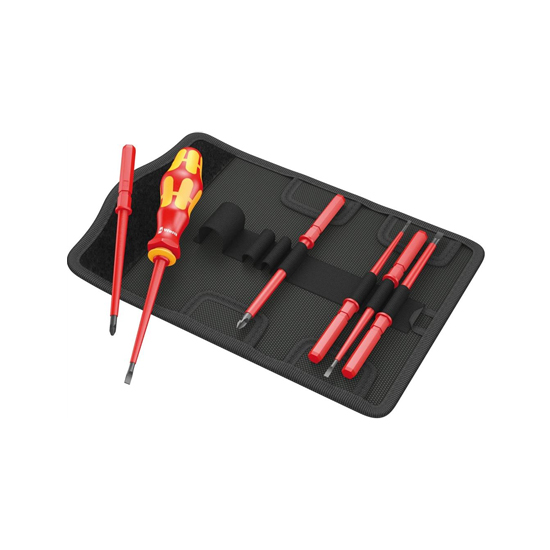6 VDE interchangeable blades with 817 VDE Kraftform handle in a robust belt pouch. Individually tested tools as per IEC 60900. Individual test in water bath at 10,000 volts for secure work at the permissible voltage of 1,000 volts.